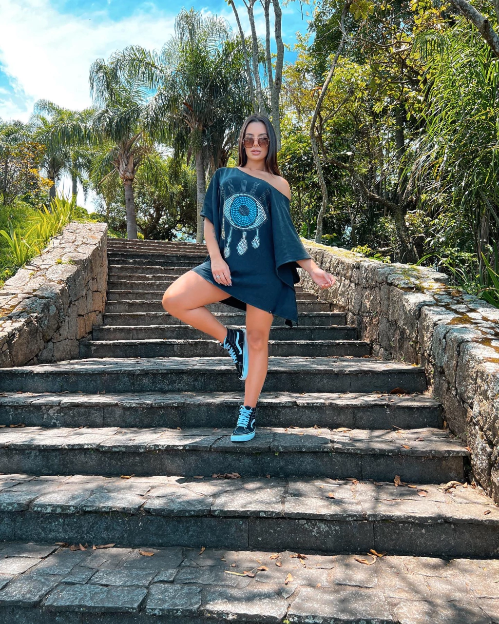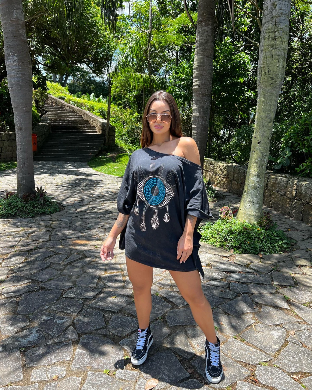 Tamanho Único, este kaftan veste confortavelmente do 40 ao 46/48, adaptando-se perfeitamente ao seu corpo. O design marmorizado, juntamente com o detalhe do olho grego cravejado, não só traz um charme especial, mas também simboliza proteção e boa sorte.