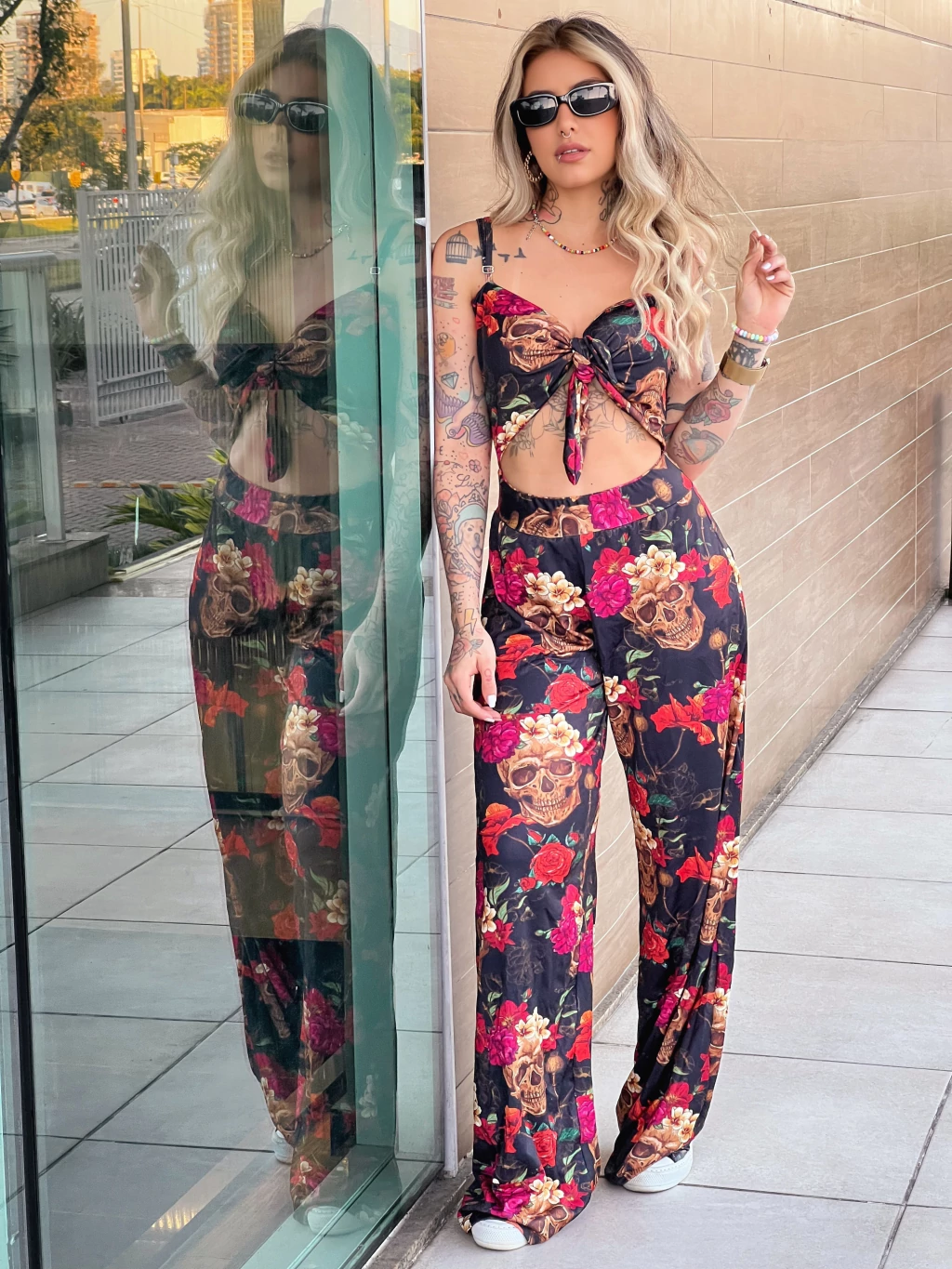 Se você busca um look único, cheio de personalidade e conforto, o Macacão Longo - Caveira Roses Roses é a escolha perfeita para você! Com uma estampa deslumbrante de caveira com rosas, esta peça traz um toque de estilo alternativo que vai destacar seu visual em qualquer ocasião.