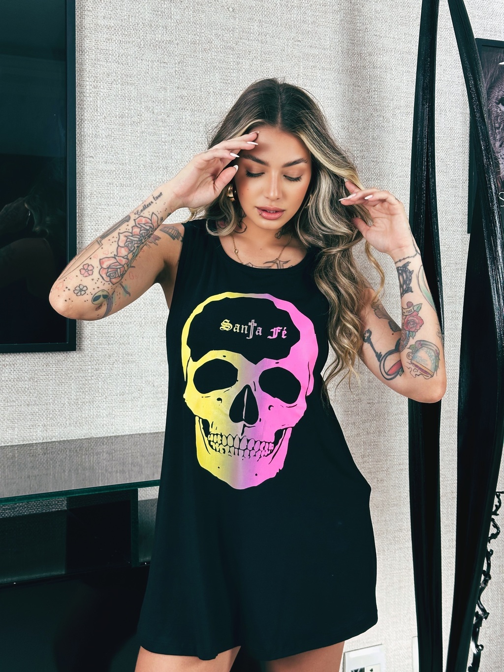 Com um tamanho único que veste super confortável do 40 ao 46, o T-dress se adapta perfeitamente ao seu corpo, garantindo um caimento incrível. Seu design moderno, com estampa de caveira colorida, traz um toque de personalidade e atitude ao seu visual, ideal para quem busca se destacar.