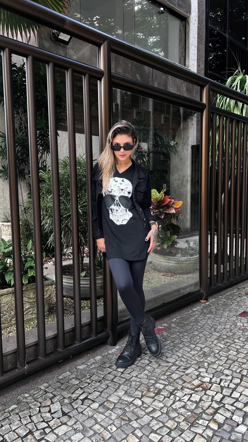 Descubra o estilo autêntico do T-dress V - Caveira Old School, confeccionado em malha Confort Premium com 96% viscose e 4% elastano. Essa composição garante um toque macio e um caimento perfeito, vestindo confortavelmente do tamanho 40 ao 44/46.